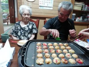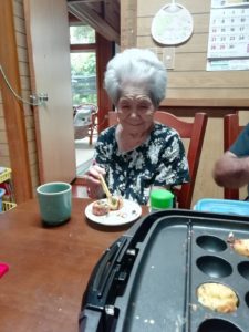 お昼に、たこ焼きを作って食べました!でも、おばあちゃんは、 たこ焼きはイマイチの様子で、顔も少ししかめ面。 笑ってと催促しても笑ってくれませんでした。ザンネン。 中が煮えてないと!これがたこ焼きだと何度も説明しても、 納得せず、もう一回焼けと。たこ焼きは沖縄にはなかったんだね。
