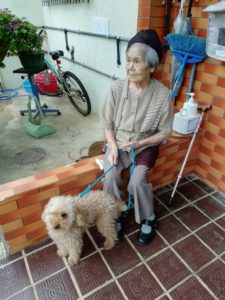 デイサービスに出かける前のおばあちゃんです。 支度は全部自分でやります。迎えの車が来るまで玄関に座って待っ てます。今日は私が犬を連れ出したので、 一緒に写メ撮ってみました。本当は動物が嫌いなのです。でも、 私が可愛がるから一緒に可愛がってるようです。