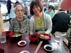魚市場があって、そこで、まぐろ丼を食べました。650円なのに 県民割があって500円に。県民割って!ちょっと笑えた!