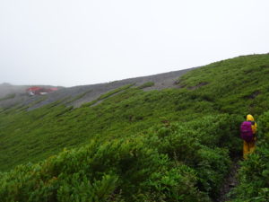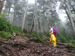 蝶ヶ岳ヒュッテに、無事に到着した後、歓迎の大雨!