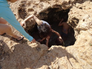 洞窟の中に、はしごで降りて、 光が射し込む海の様子が見られます。